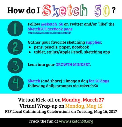 Once you are following Sketch 50, starting on Monday, March 27, 2017, look for the word of the day. Get inspired by the community of learners posting to #sketch50 and sketch away! This can be a personal journey or one that you share with your students. However you decide to participate, don’t forget to share to @sketch_50 on Twitter or Instagram.